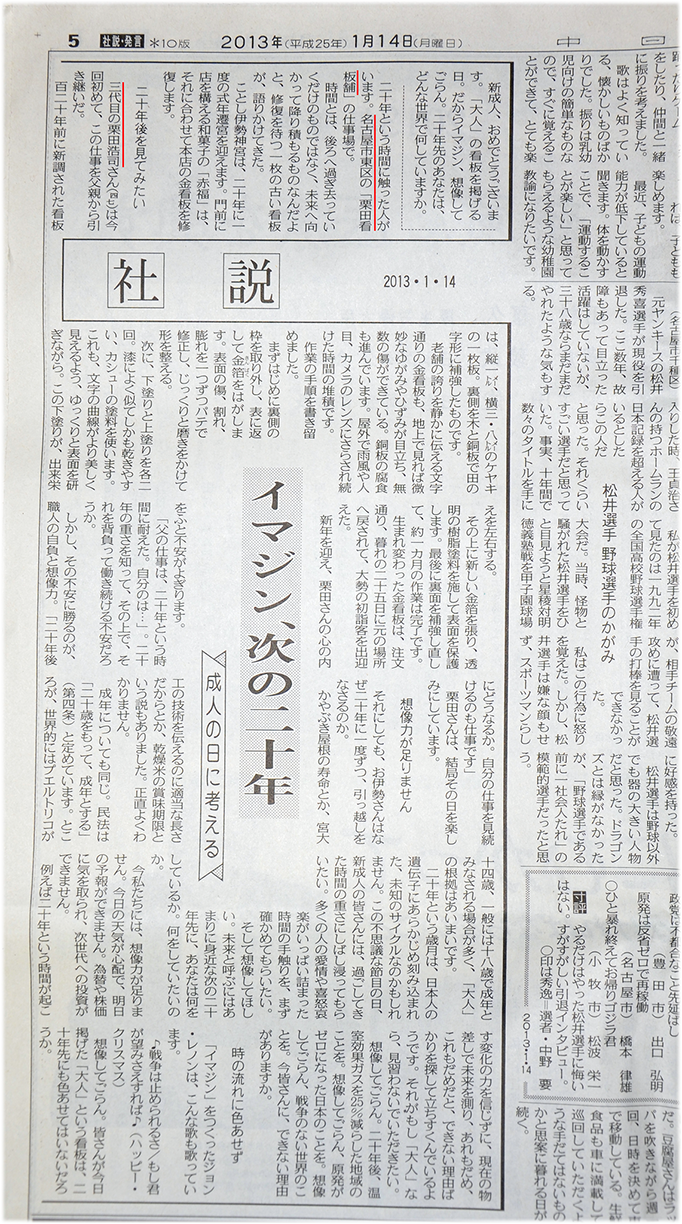 ● 14th January 2013 in the editorial “Imagine, the next twenty year - Thinking on the Coming of age day